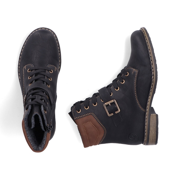 Rieker, la marque au trés bon rapport qualité prix! Bottine femme Rieker71200 00 en imitation cuir noir. Cette chaussure est munie d'un talon détaché pour un confort optimal et un amorti remarquable. Ce modèle montant à lacets et aussi muni d'une fermeture pour vous permettre de les chausser facilement tout en vous apportant un bon maintien muni d'une première souple et doublée velour. Très souple et légère cette bottine sera idéale à porter tous les jours et s'accordera facilement avec vos tenues d'hiver en apportant une pointe de fantaisie !!! Hauteur de tige:14cm Nous vous conseillons de choisir vos Rieker à la pointure.