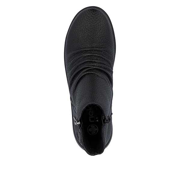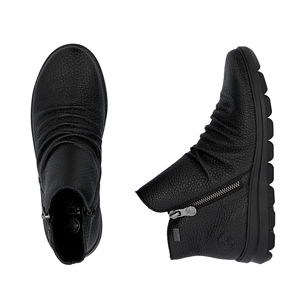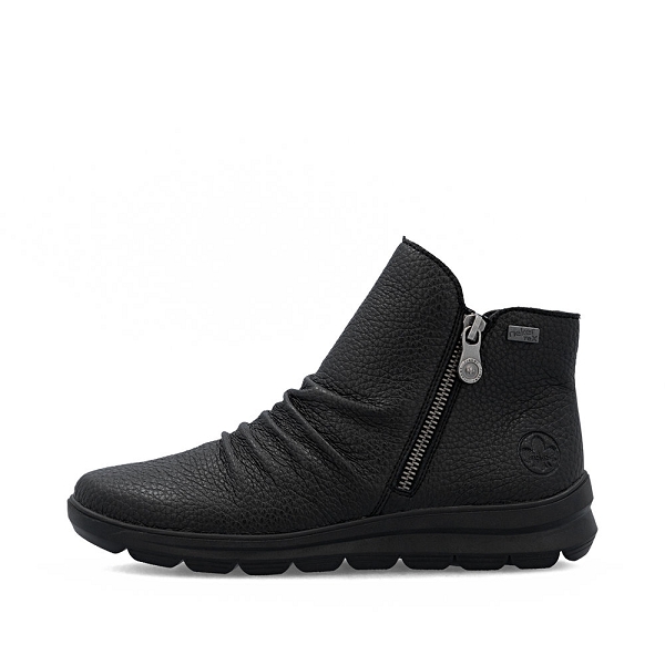 Rieker, la marque au trés bon rapport qualité prix! Bottine femme RiekerZ0056 00en cuir noir. Cette chaussure est munie d'un petit talon détaché pour un confort optimal et un amorti remarquable. Ce modèle muni d'une fermeture pour vous permettre de les chausser facilement tout en vous apportant un bon maintien. Celle-ci est munie d'une semelle amovible soft. Très souple et légère cette bottine sera idéale à porter tous les jours et s'accordera facilement avec vos tenues d'hiver en apportant une pointe de fantaisie !!! Cette chaussure imperméable est dotée de la technologie "rieker tex". Hauteur de tige:9cm. Nous vous conseillons de choisir vos Rieker à la pointure.
