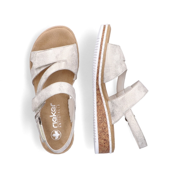 Rieker, la marque au trés bon rapport qualité prix! RIEKER V3666-60 est unesandale femmebeige. Cette sandale Rieker entièrement réglable avec deux velcros sur le cou-de-pied ainsi qu'un sur le talon sera facile à chausser et idéale pour les beaux jours. Ce modèle à découvrir chez Rieker-webstore.fr est muni d'un talon compensé et d'une semelle duveteuse pour améliorer votre confort. Ce modèle de sandale est parfait pour tous les jours, à la fois décontracté il est devenu un incontournable en été pour vous mesdames. Nous vous conseillons de choisir vos Rieker à la pointure. Livraison rapide, chez-vous en 48h.