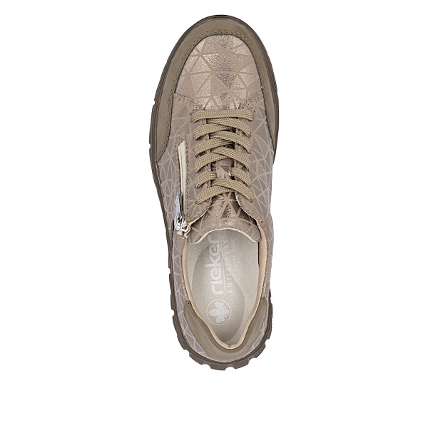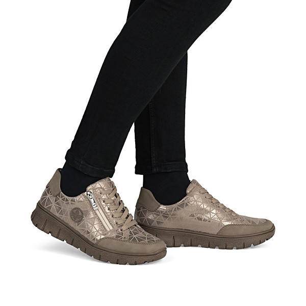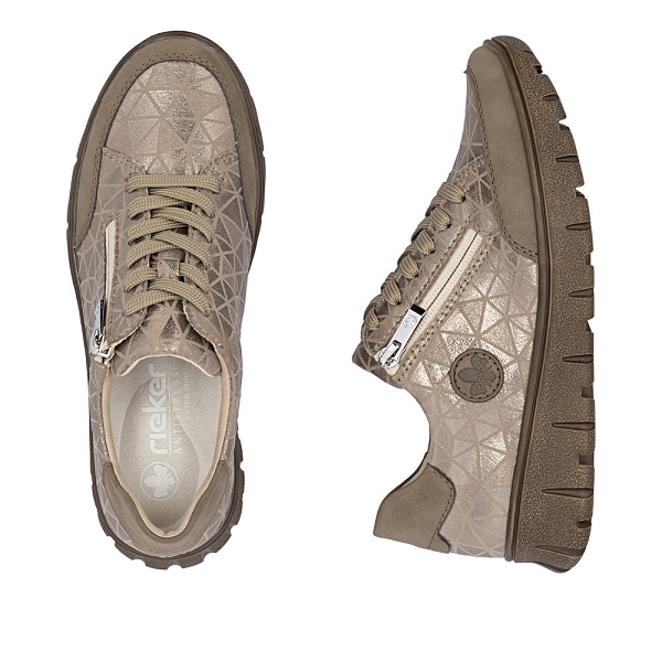 Rieker, la marque au trés bon rapport qualité prix! Tennis femme Rieker N1303 62cuir beige motif géométrique Cette tennis Rieker sera idéale pour les femmes qui veulent adopter un style sportswear. Cette chaussure grande largeur à talon compensé vous apportera un confort de marche. Cette tennis à lacets est munie d'une fermeture zip ce qui permettra de les chausser plus facilement. Ce modèle s'adaptera à tous les pieds avec sa semelle amovible "soft". Nous vous conseillons de choisir vos Rieker à la pointure.